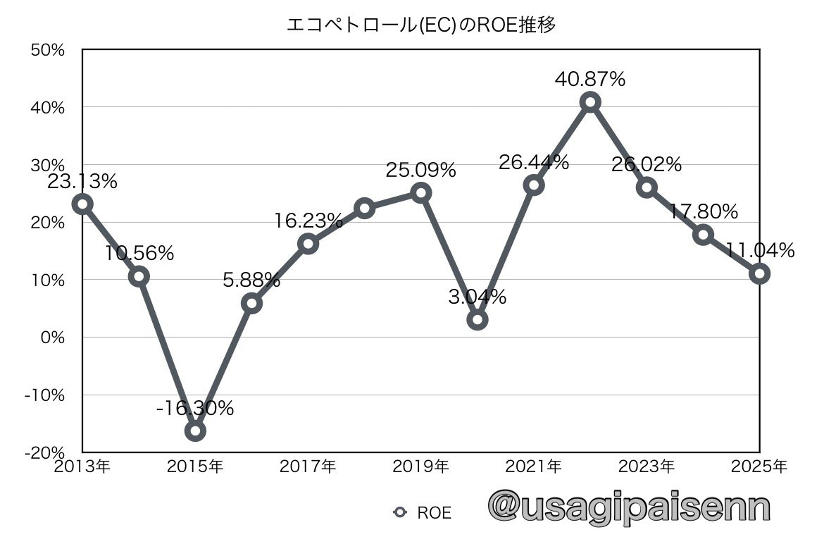 こちらは純利益と純資産から算出した過去10年間のROEの推移グラフになります。