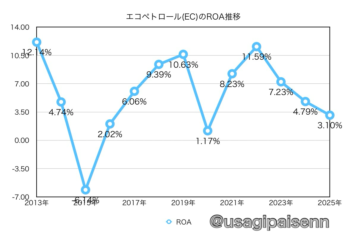 こちらは純利益と総資産から算出した過去10年間のROA推移グラフになります。